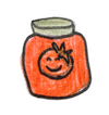 Drawing of a tomato jar with a smiling face and a label with a smiling fruit.